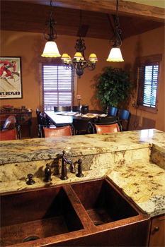 stove, copper sink, Juperana Lapidus granite counters, and a custom